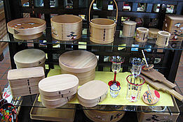 杉や檜の薄い板材を曲げ、板の端を桜の皮で綴じ合わせて作る容器です。 飯びつ、茶びつ、弁当箱などの生活用品や、茶道で使う建水、菓子器など様々にあり、飯びつ、弁当箱はご飯がおいしく食べられると、その良さが見直されています。